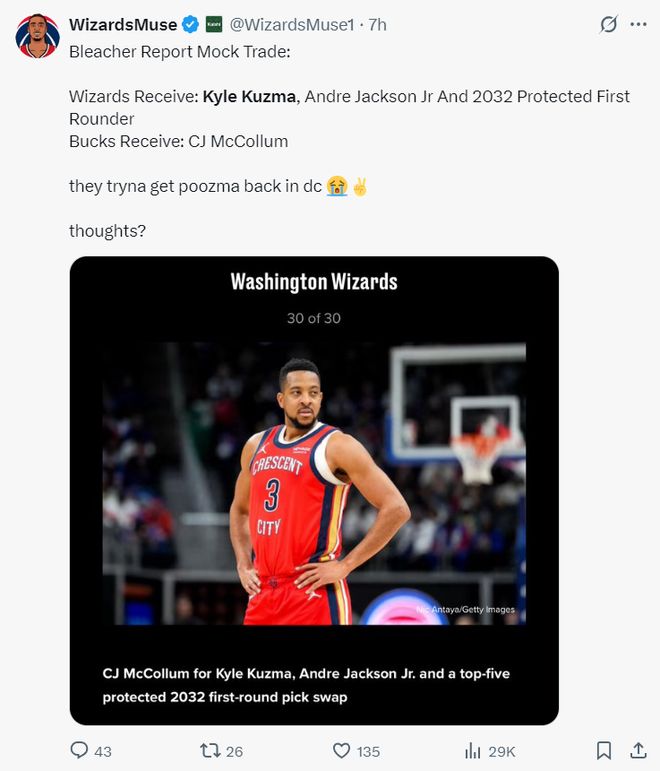 实际上美媒BR最近两天已经模拟了两套库兹马的交易方案,一套是跟奇才交易,雄鹿送出库兹马、安德森-杰克逊、2032年受保护首轮从奇才换到麦科勒姆。